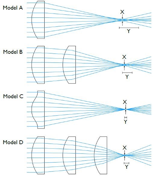 D型-三透鏡系統(tǒng):一種高質(zhì)量的選件,與Model A或Model B相比,聚焦時(shí)的光斑尺寸更小,或者在準(zhǔn)直時(shí)具有更高的質(zhì)量準(zhǔn)直。它的材料范圍也比Model C多。