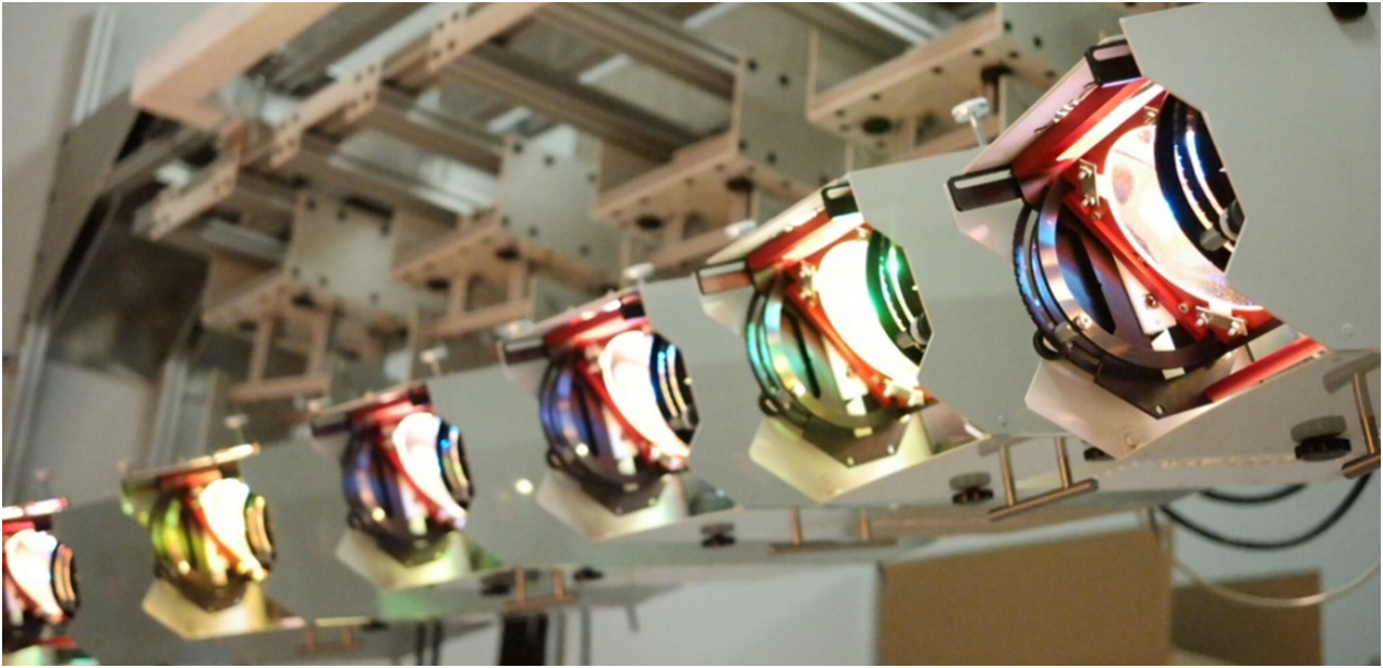 我們使用了8個(gè)2kW的QTH燈提供了1.5 x 1.5m2的輻照面積。輻照強(qiáng)度從1個(gè)太陽到0.1個(gè)太陽可調(diào)??蛻粢髮⒐庾V限制在紅外波長范圍內(nèi)。